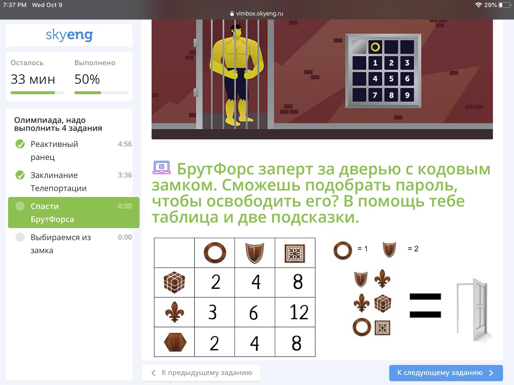 БрутФорс заперт за дверью с кодовым замком. Сможешь подобрать пароль, чтобы освободить его? В помощь тебе таблица и две подсказки.
