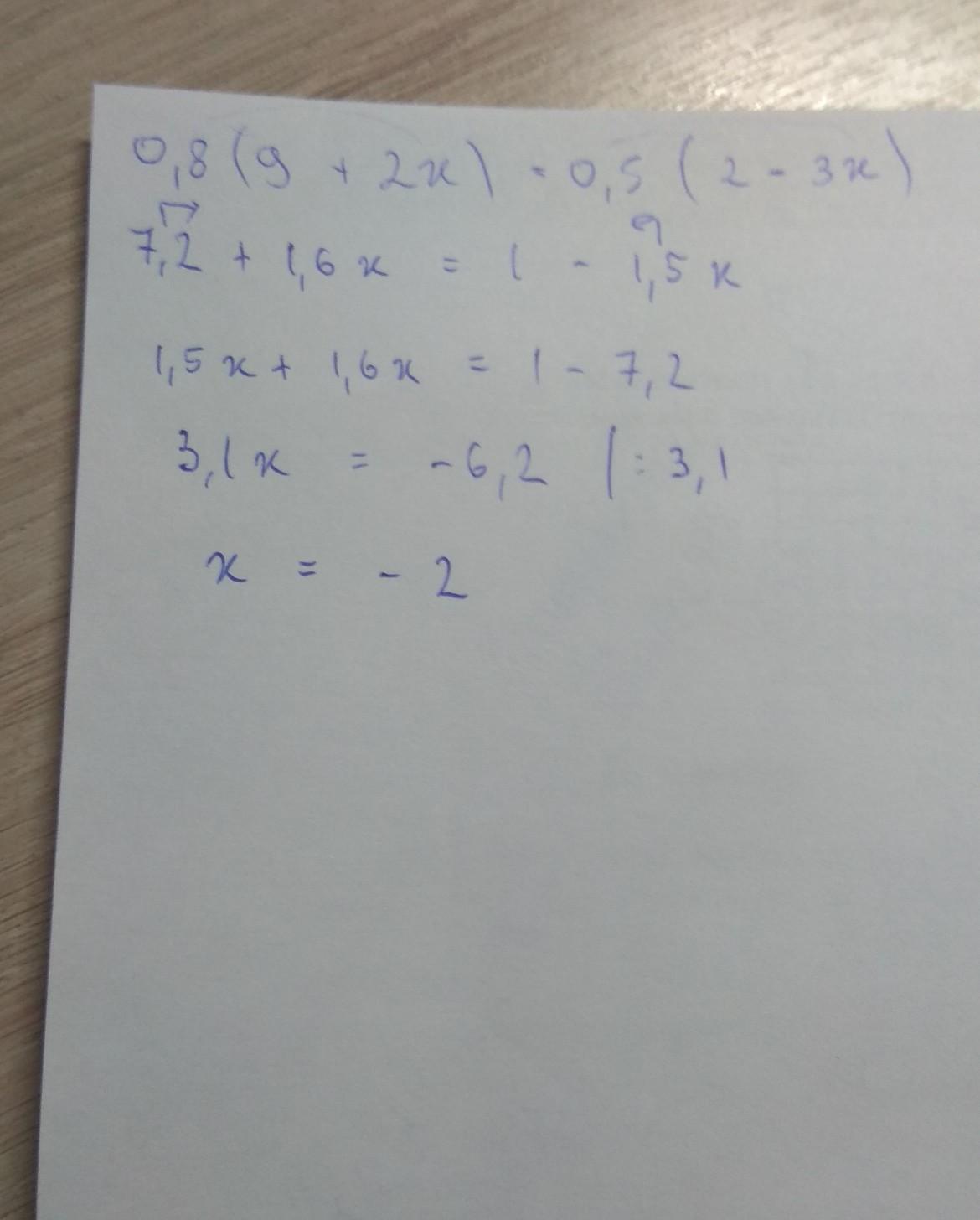 0,8 (9 + 2x) = 0,5 (2 - 3x)