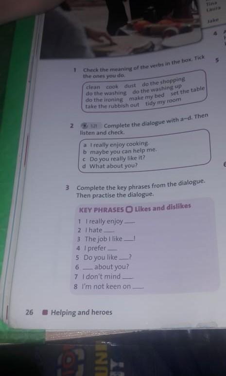 Номер 3 невозможно сделать без аудирования. Могу предположить, что в первом I really enjoy cooking, т.к. такая же фраза есть во втором упражнении.