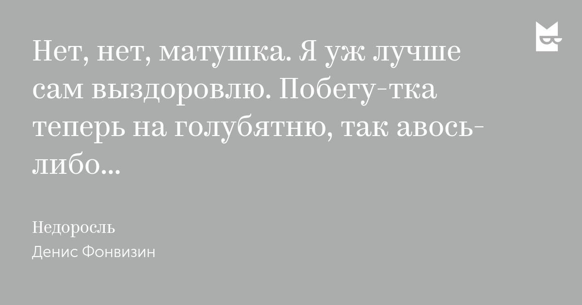 Г-жа Простакова. Уж не послать ли за доктором в город? Митрофан. Нет, нет, матушка. Я уж лучше сам выздоровлю. Побегу-тка теперь на голубятню, ...