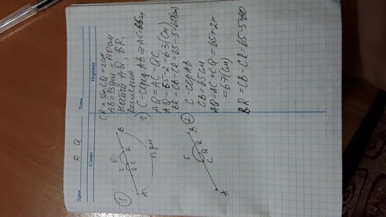 на отрезке ав длина которого 13 дм отметили точки c r q так что c середина ab cr = 5 см cq = 2 см найти aq, br