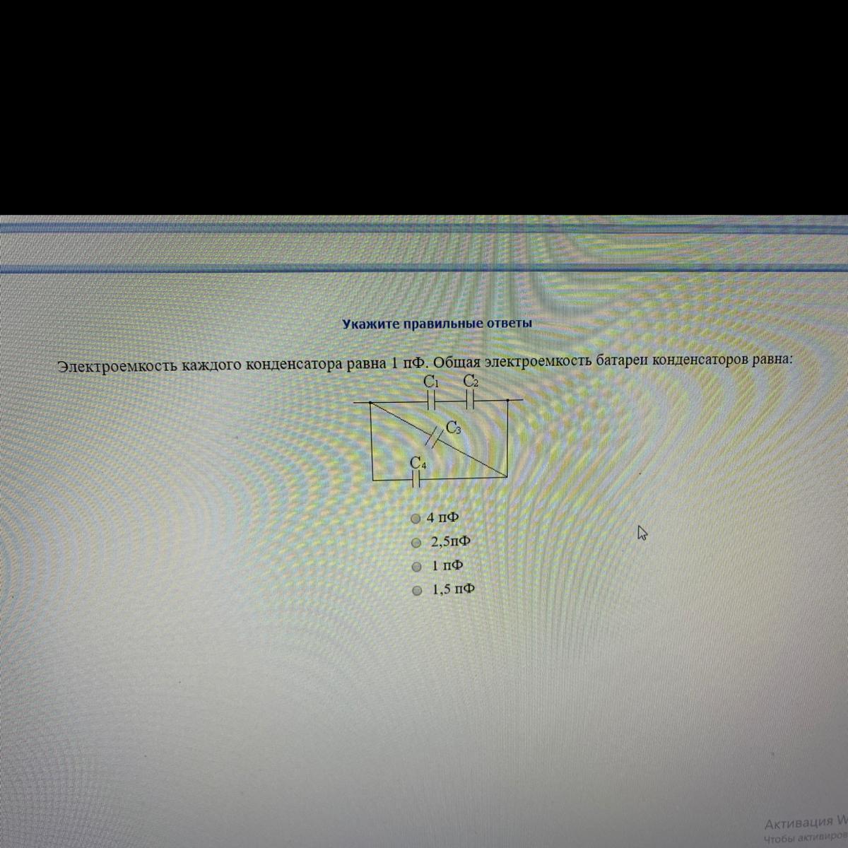 Электроемкость каждого конденсатора равна 1 пФ. Общая электроемкость батарен конденсаторов равна: