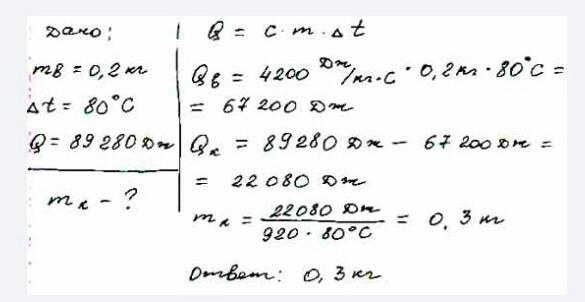 определите массу алюминиевой кастрюли в которой было доведено до кипения 200 г воды с начальной температурой 20 если на это было затрачено количество теплоты равное 89280 дж