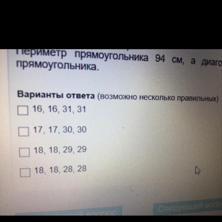 Периметр прямоугольника 94 см,а диагональ 36 см. Угол между данной диагональю и стороной 30 градусов. Найти стороны прямоугольника. Варианты ответов в закреплённом фото. Прошу помочь.