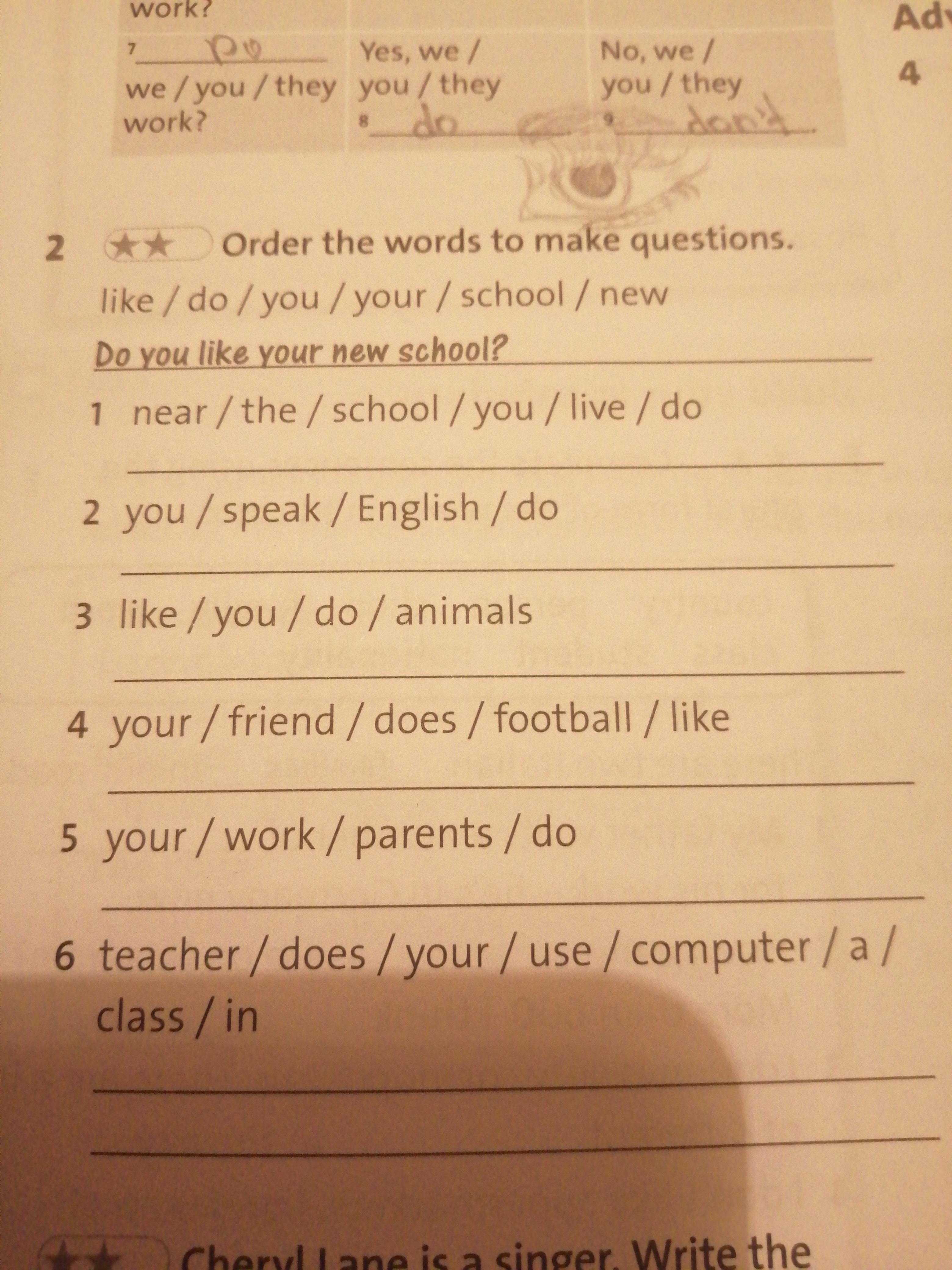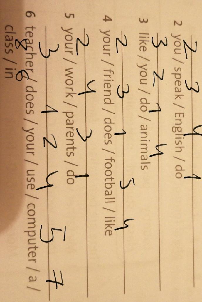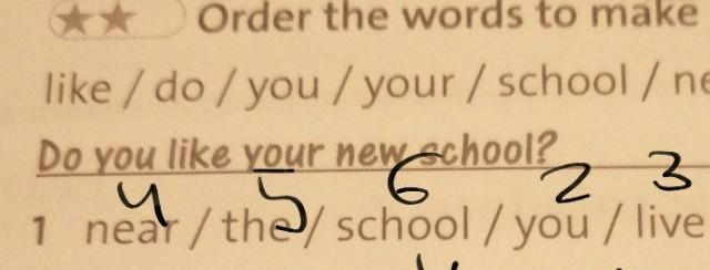 ответ на фото. Цифра - номер слова в предложении. (первое предложение-do you live near the school)
