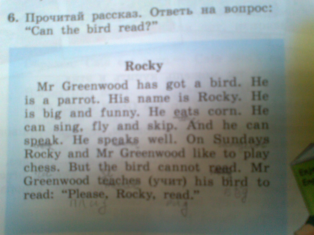 У мистера Гринвуда есть птица. Он попугай. Его имя - Роки. Он большой и забавный. Он ест кукурузу. Он может петь, летать и прыгать. И он может разговаривать. Он говорит хорошо. По воскресеньям Роки и мистер Гринвуд любят играть в шахматы. Но птица не умеет читать. Мистер Гринвуд учит свою птицу читать: "Пожалуйста, Роки, читай."