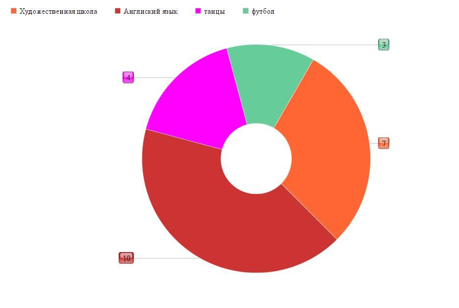 В 6 классе учащиеся ходят в различные секции: 7 человек – в художественную школу, 10 человек – на английский язык, 4 человека – на танцы, 3 человека – на футбол. Постройте круновую диаграмму, отражающую эти данные.