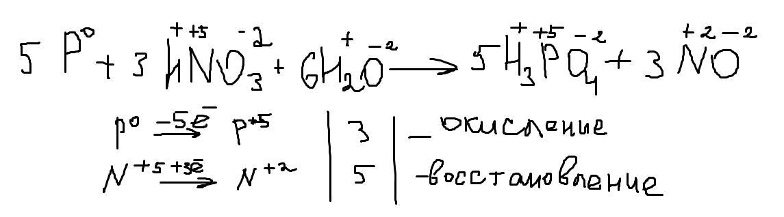 расставить коэффициенты методом электронного баланса\ розставити коефіцієнти методом електронного балансу P + HNO3 + H2O → H3PO4 + NO.