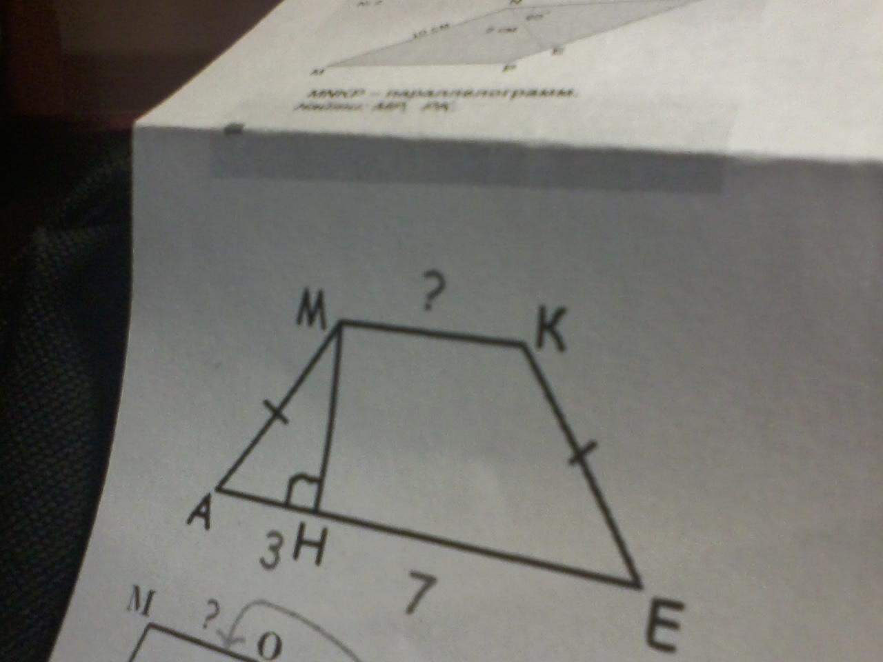 Проведем еще одну высоту KF, BH=KF (т.к. высоты трапеции). HMKF-параллелограмм, тогда MK=HK. Треугольники AMH=KFE, следовательно AH=FE=3. HE=HF+FE. HF= MK= HE-FE=7-3=4