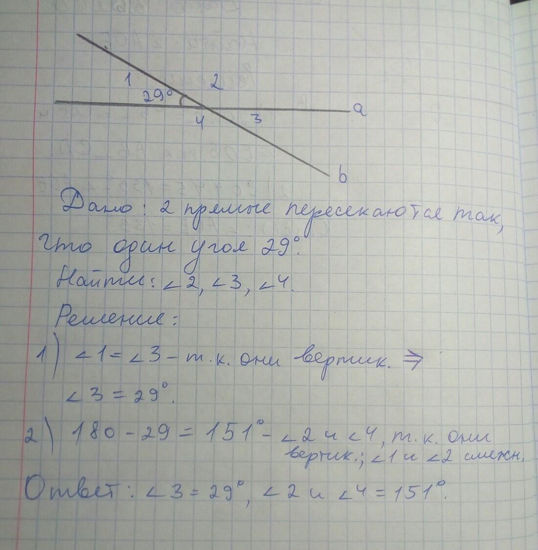 найдите углы,образованные при перессечении двух прямых, если один из равен 29 градусов пж помогите!!!!