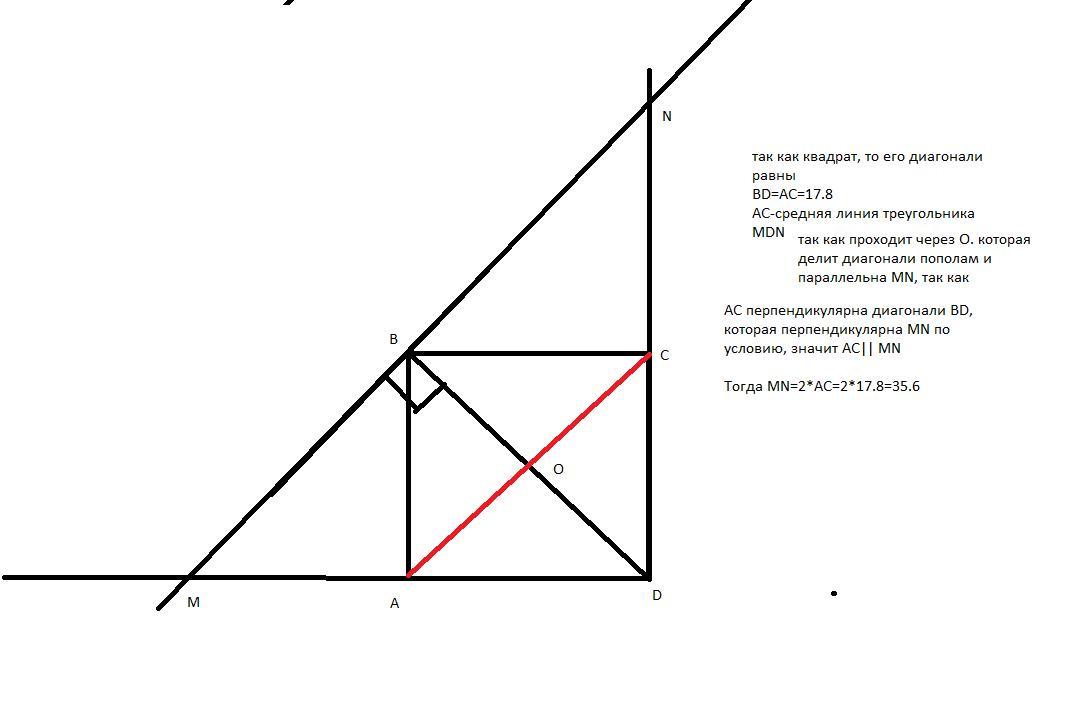Через конечную точку B диагонали BD=17,8 ед. изм. квадрата ABCD проведена прямая перпендикулярно диагонали BD. Проведённая прямая пересекает прямые DA и DC в точках M и N соответственно.