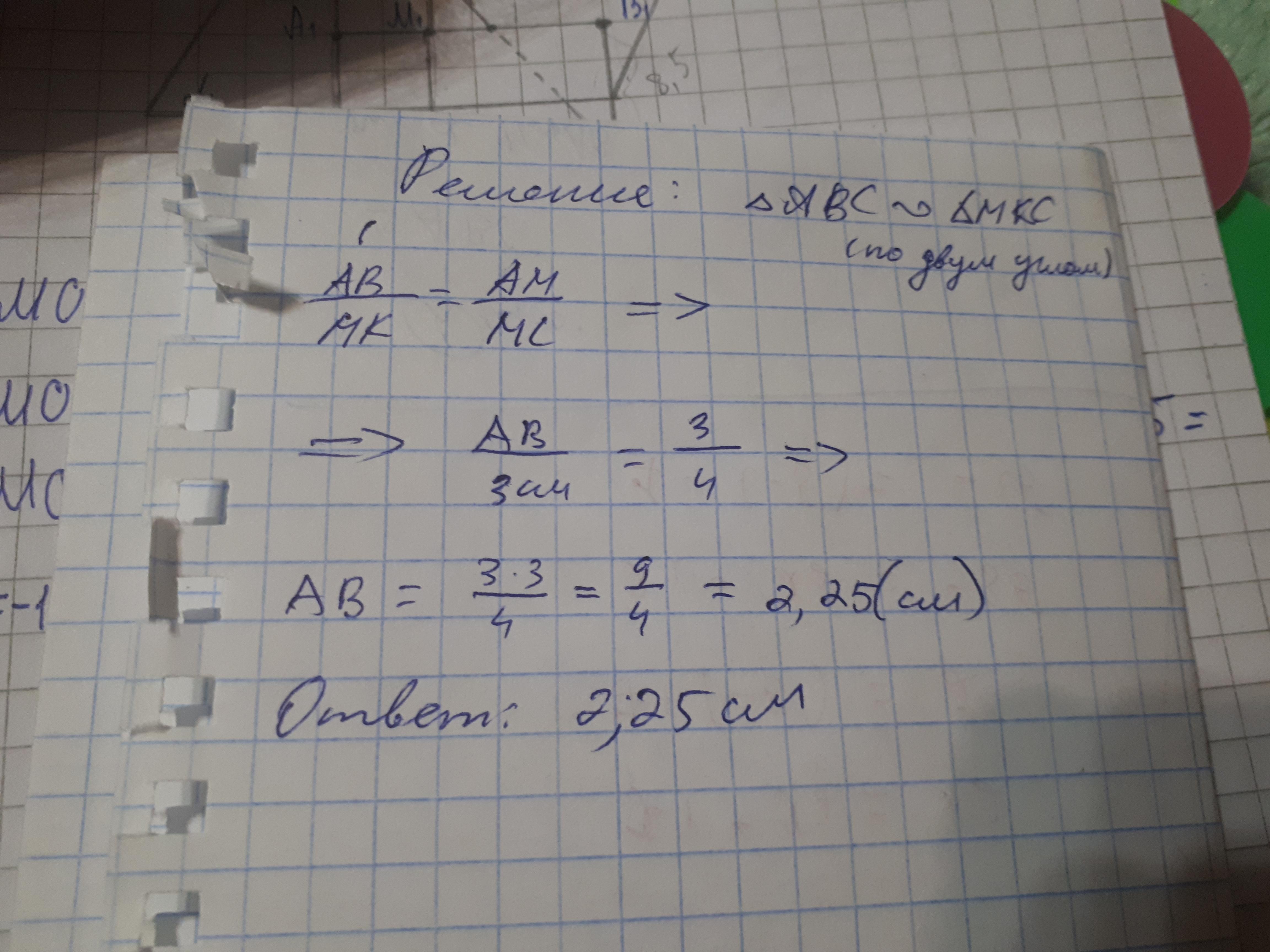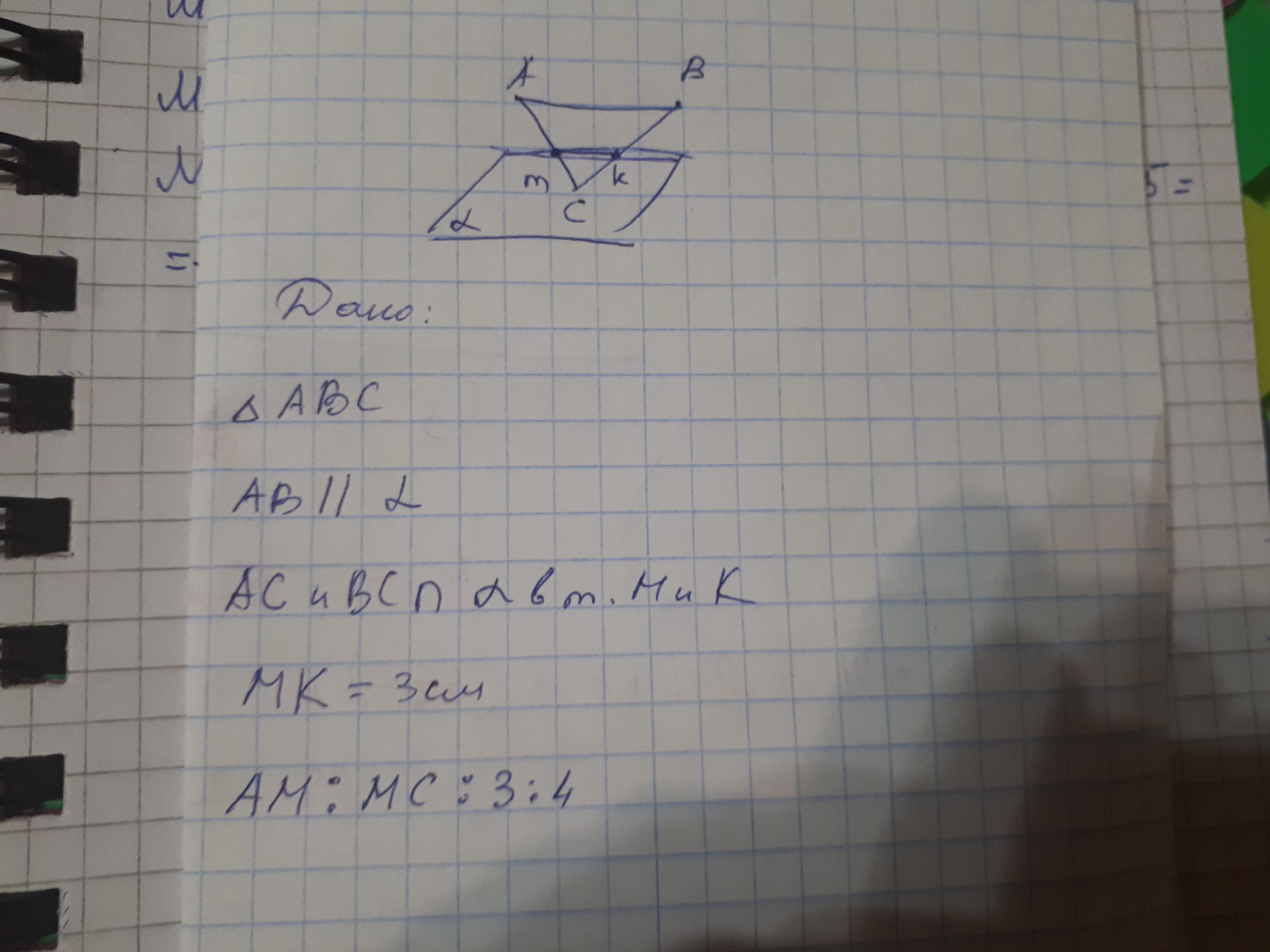 плоскость альфа параллельна стороне ab треугольника abc и пересекает его стороны ac и bc в точках m и k. найти ab, если mk= 3 см и am:mc= 3:4