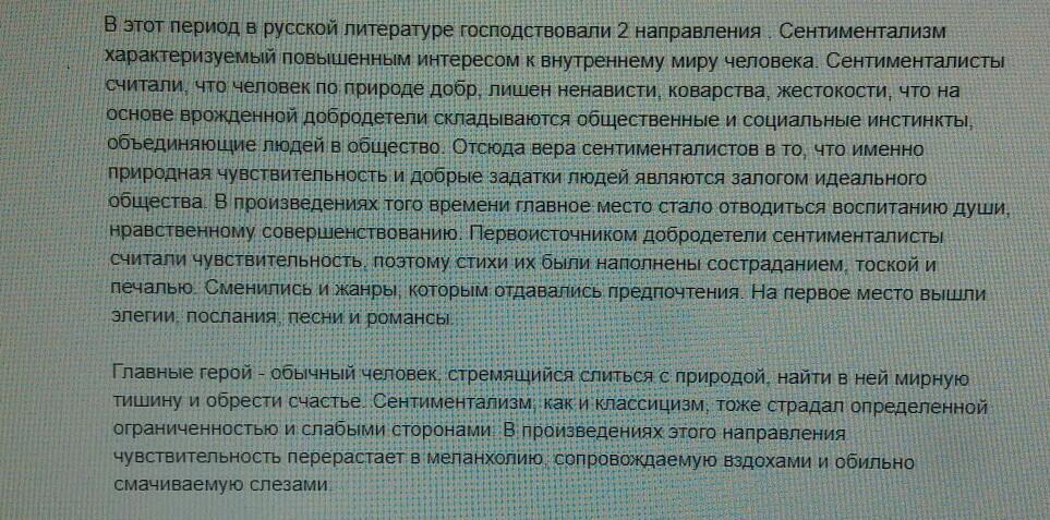В этот период в русской литературе господствовали 2 направления . Сентиментализм характеризуемый повышенным интересом к внутреннему миру человека. Сентименталисты считали, что человек по природе добр, лишен ненависти, коварства, жестокости, что на основе врожденной добродетели складываются общественные и социальные инстинкты, объединяющие людей в общество. Отсюда вера сентименталистов в то, что именно природная чувствительность и добрые задатки людей являются залогом идеального общества. В произведениях того времени главное место стало отводиться воспитанию души, нравственному совершенствованию. Первоисточником добродетели сентименталисты считали чувствительность, поэтому стихи их были наполнены состраданием, тоской и печалью. Сменились и жанры, которым отдавались предпочтения. На первое место вышли элегии, послания, песни и романсы.