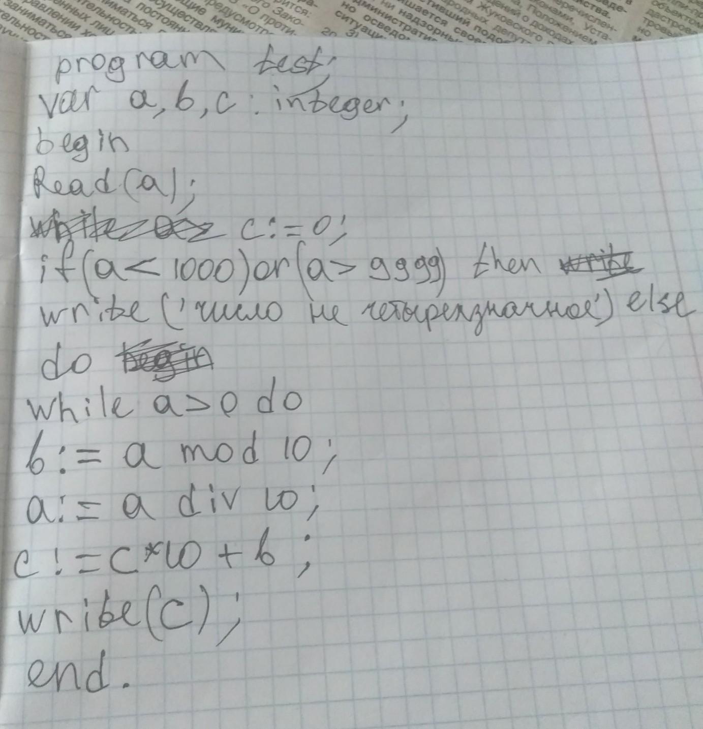 Помогите с информатикой. Напишите программу на паскале. Дано натуральное число n (n 9999). Если число четырёхзначное, то получите и выведите перевёртыш этого числа (3528 → 8253), иначе выведите ответ "Число не четырехзначное".