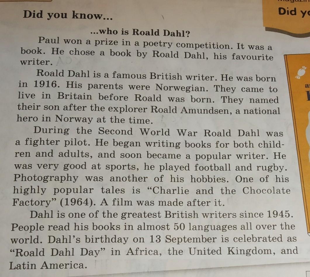 Пол выиграл приз в конкурсе поэзии. Это была книга. Он выбрал книгу Роальда Даля, своего любимого писателя. Роальд Даль - известный британский писатель. Он родился в 1916 году. Его родители были норвежцами. Они приехали жить в Британию до рождения Роальда. Они назвали своего сына в честь исследователя Роальда Амундсена, национального героя в Норвегии того времени. Во время Второй мировой войны Роальд Даль был летчиком-истребителем. Он начал писать книги для детей и взрослых и вскоре стал популярным писателем. Он был очень хорош в спорте, он играл в футбол и регби. Фотография была еще одним из его увлечений. Одна из его очень популярных сказок - «Чарли и шоколадная фабрика» (1964). После этого был снят фильм. Даль является одним из величайших британских писателей с 1945 года. Люди читают его книги почти на 50 языках по всему миру. День рождения Даля 13 сентября отмечается как «День Роальда Даля» в Африке, Великобритании и Латинской Америке.