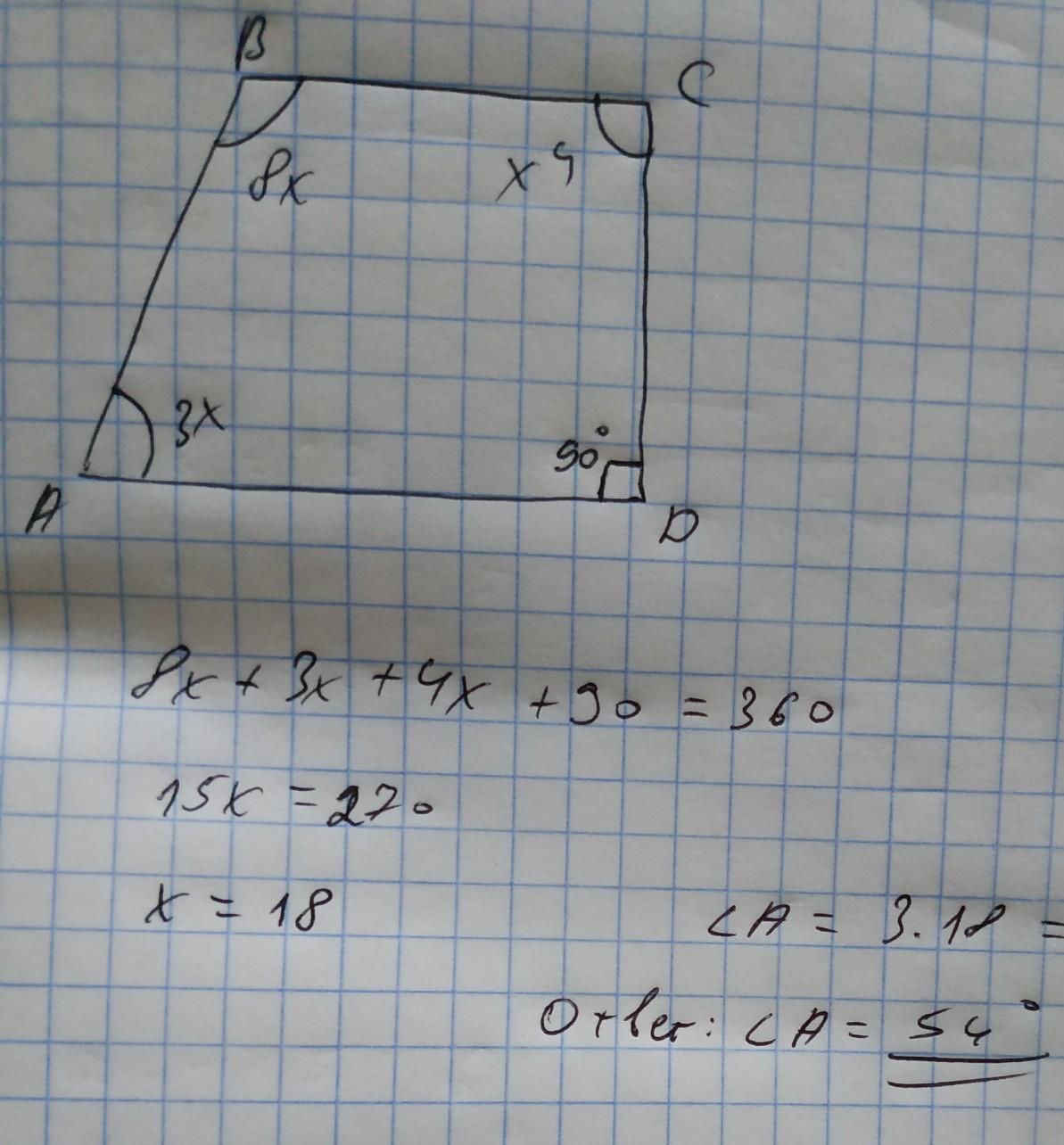 Один из углов выпуклого четырехугольника-прямой, остальное относятся как 3:4:8 Найдите наименьший угол четырехугольника.