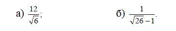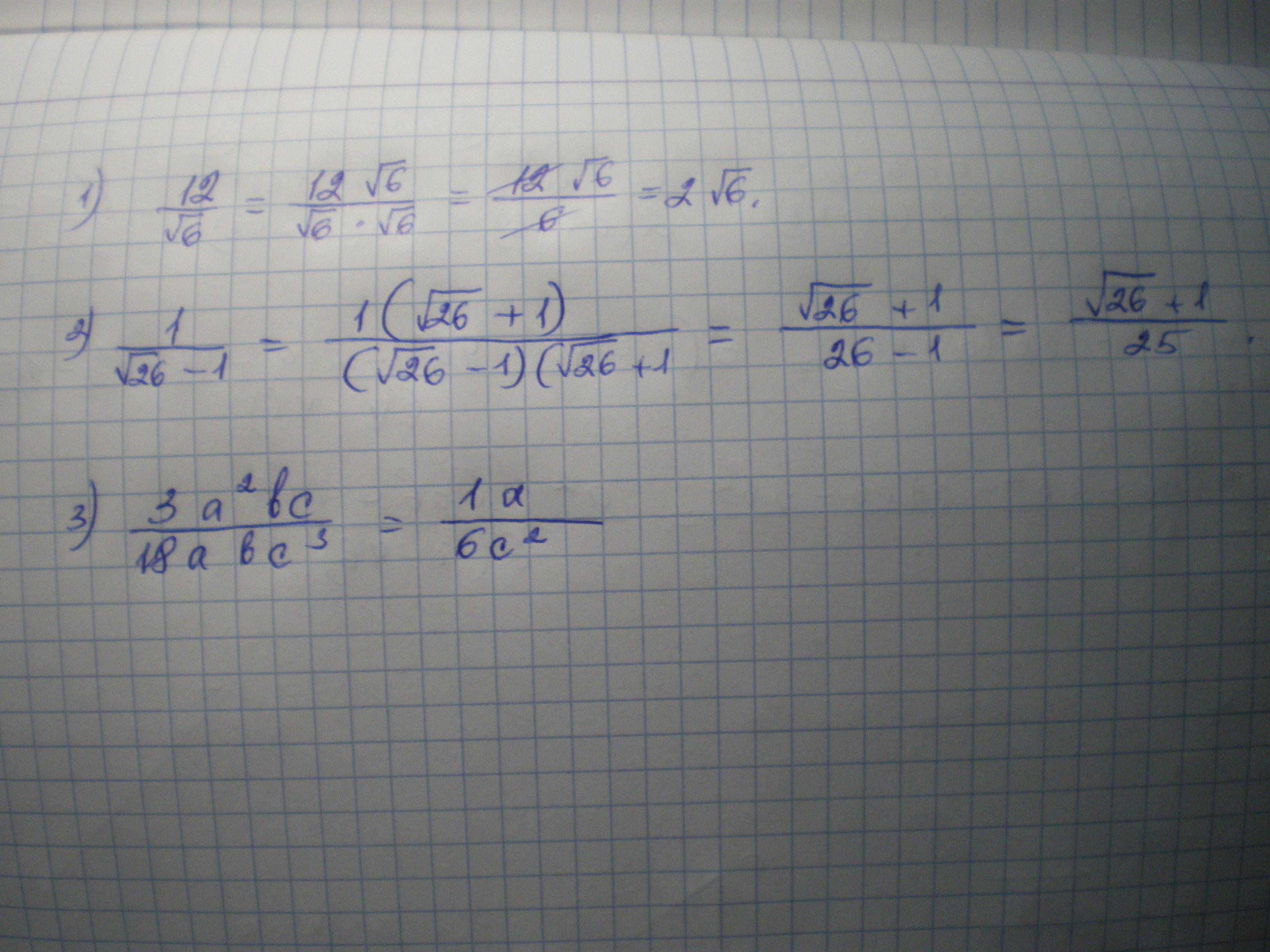 Сократите дробь 3a^2bc/18abc^3 И избавьтесь от иррациональности в знаменатели дроби 12/√6 и 1/√26-1