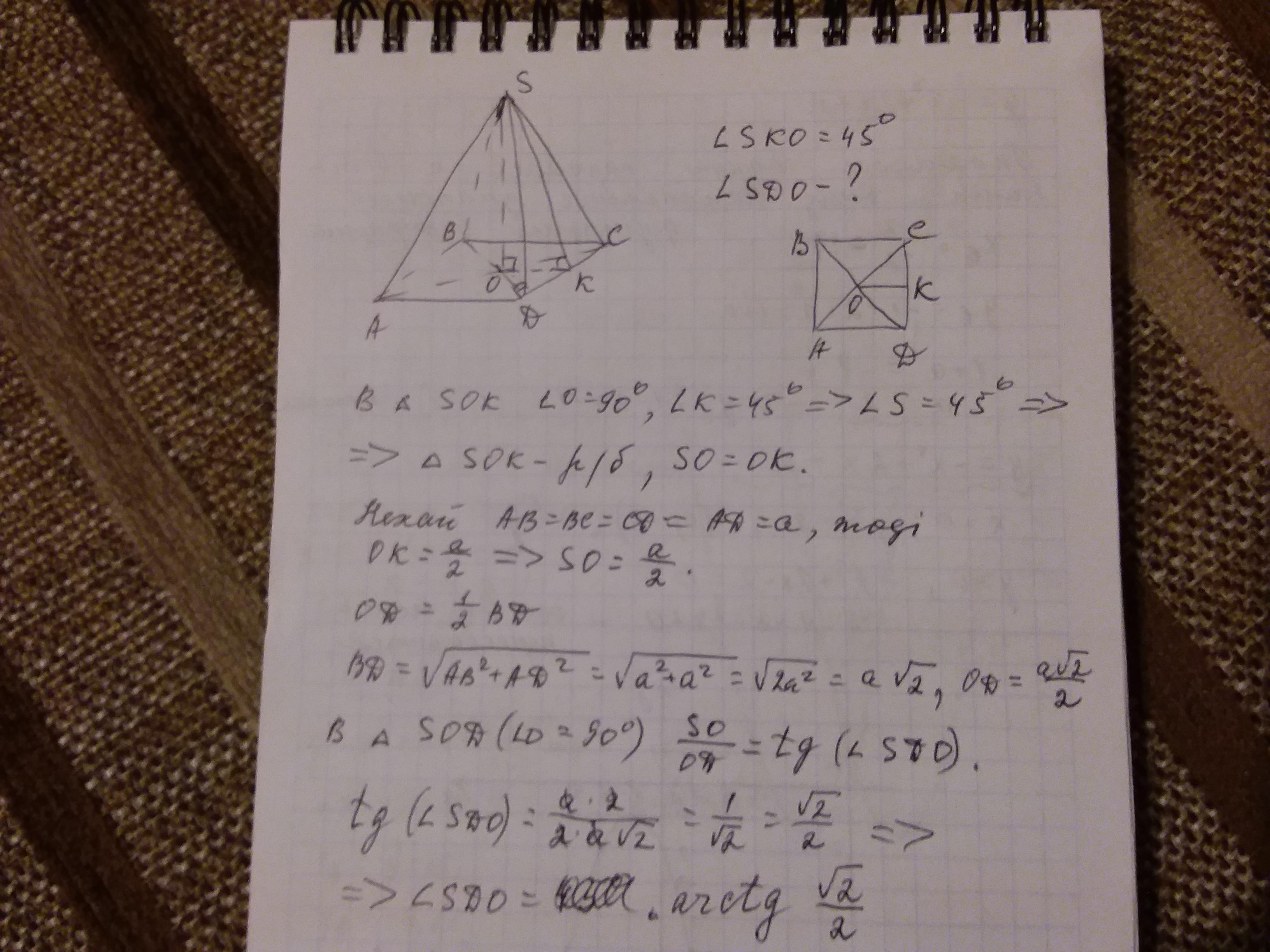У правильній чотирикутній піраміді двогранний кут при основі дорівнює 45 градусів.
