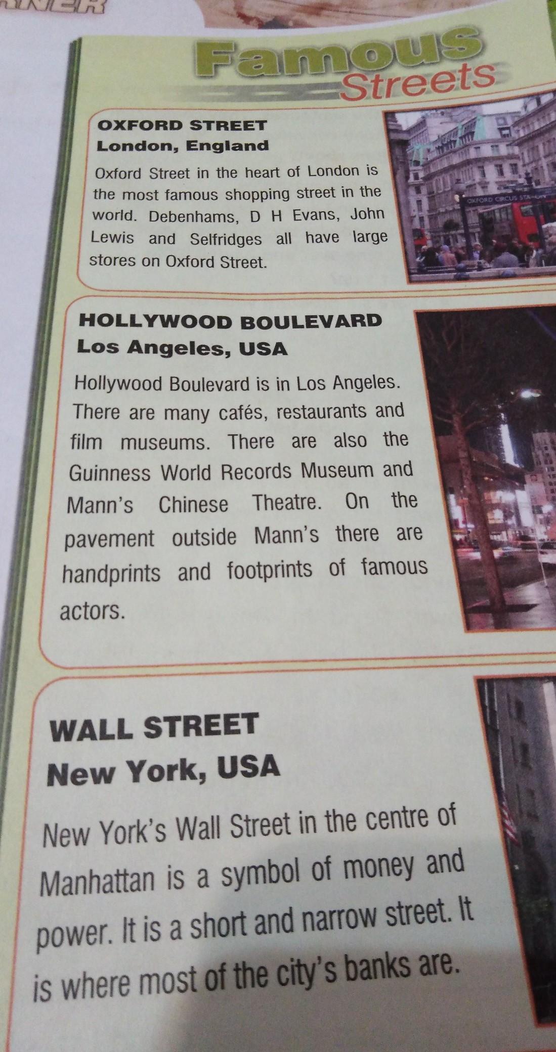 Голливудский бульвар, Лос-Анджелес, США . Там много кафе, ресторанов и музеев кино. Там также расположены Музей мировых рекордов Гиннеса и Китайский театр Манна. На тротуаре возле Манна есть отпечатки рук и ног знаменитых актёров.