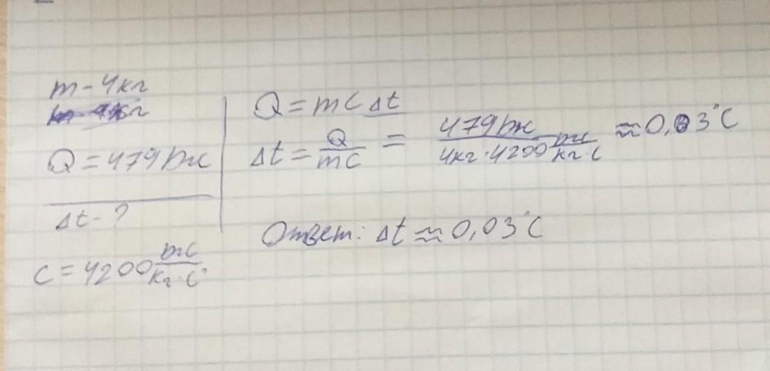 Определи, на сколько градусов нагреется вода объёмом 4 л, если ей сообщить количество теплоты, равное 479 Дж. Удельная теплоёмкость воды равна 4200 Дж/(кг·°C), плотность воды — 1000 кг/м³.