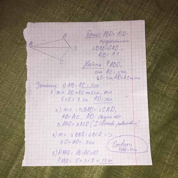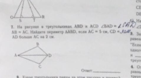 На рисунке в треугольнике ABD и ACD угол BAD=углу CAD .AB=AC. Найдите периметр ABD,если AC=5 см,CD=3 см, AD больше AC на 2 см