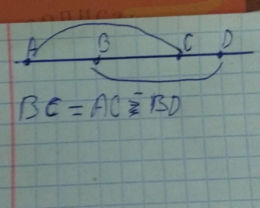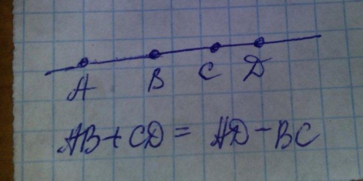 На прямой последовательно отмечены точки A, B, C и D. Представьте сумму отрезков AB и CD в виде разности двух отрезков. Сделайте рисунок
