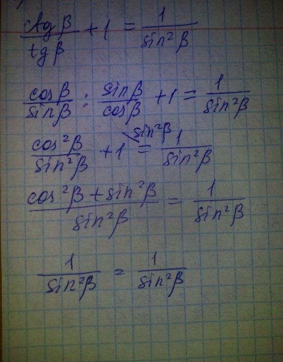 Из левой части (ctgβ/tgβ)+1=(cosβ/sinβ)²+1=(cos²β+sin²β)/sin²β=1//sin²β