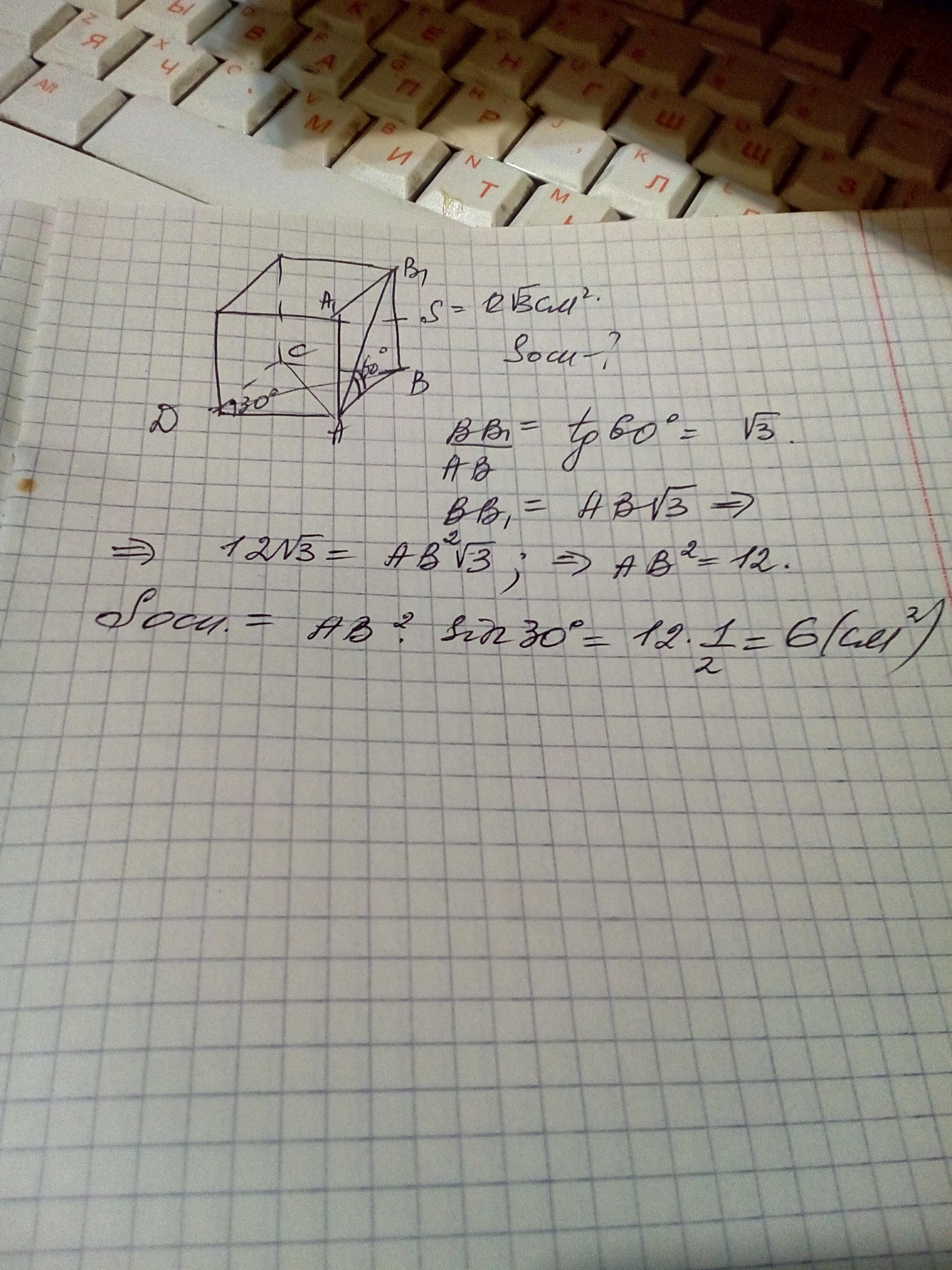 В основе прямого паралепипеда лежит ромб с острым углом 30 ° Диагональ боковой грани нахилина к плоскости основания под углом 60 ° а площадь этой грани равна 12√3 см^2. Найдите площадь основания цйого параллелепипеда.