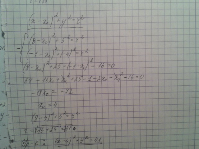 составьте уравнение окружности проходящей через точки (8;5), (-1;-4) и имеющие центр на оси абсцис