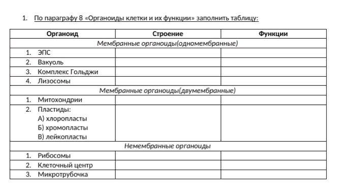 Одномебранные органоиды:Эндоплазматическая сеть Функция Транспорт газов,синтез липидов,синтез белков.Комплекс Гольджи особенности строения стопки уплощенных дисков и пузырьков.Функция накопление вынос из клетки,по-другом называется склад.Лизосомы-это Пузырьки с ферментами .Функция Внутриклеточное переваривание пищи.Двумембранные органоиды Митохондрии особенности строения наружная мембрана,внутренняя мембрана имеют свою днк и рибосомы.Функция Окисление органических веществ с помощью кислорода и образуется молекулы АТФ при это энергия освобождается,по-другому называется клеточное дыхание.Пластиды к ним относятся хлоропласты,хромопласты,лейкопласты.Особенности строения Наружная гладкая мембрана и внутренняя имеет ввиде стопок имеют свою ДНК и рибосомы.Функции,хлоропласты функция фотосинтез с помощью энергии солнца,хромопласты окраска,лейкопласты запас питательных веществ.Ядро функция хранение и передачи наследственной информации.Рибосома-это мелкие тельца грибовидно формы находятся на гранулярной ЭПС.Функция Синтез белка и биосинтез белка.клеточный центр-это две центриоли,состоящие из микротрубочек.Функция учавствует в деление клетки.