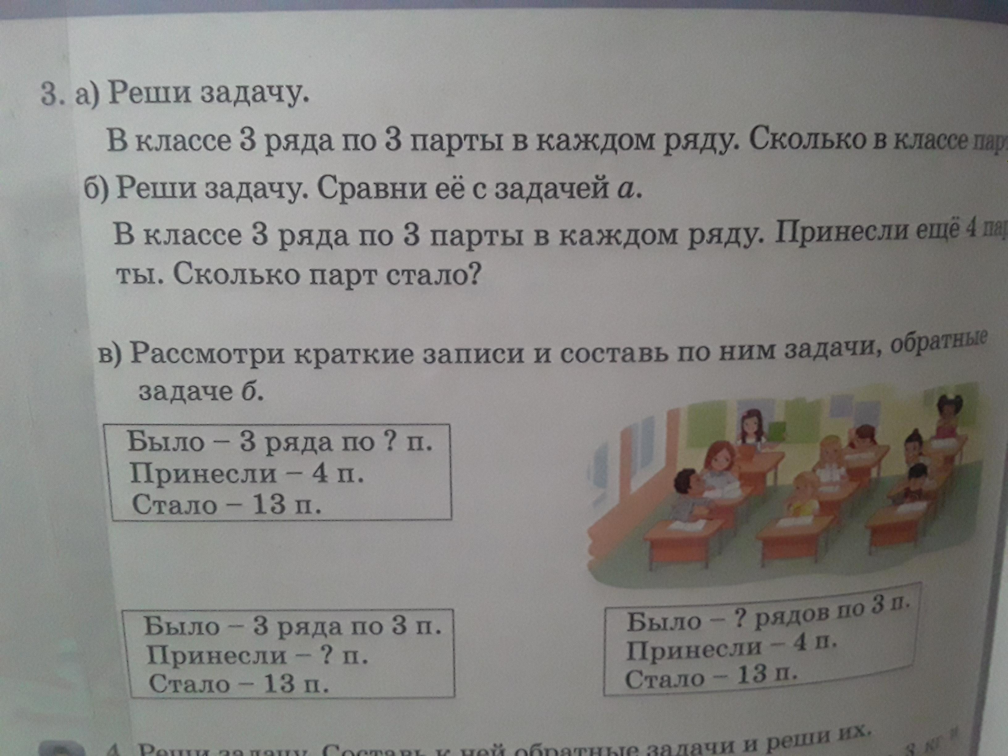 в классе было три ряда по три парты, принесли еще несколько парт и парт в классе стало 13. сколько парт принесли?