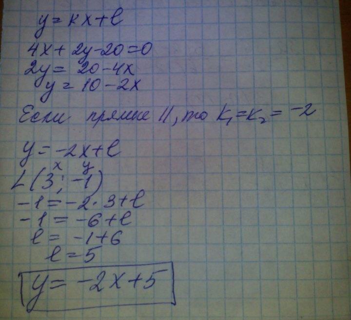 Составьте уравнение прямой, которая переходит через точку L (3;-1) параллельно прямой 4x+2y-20=0.