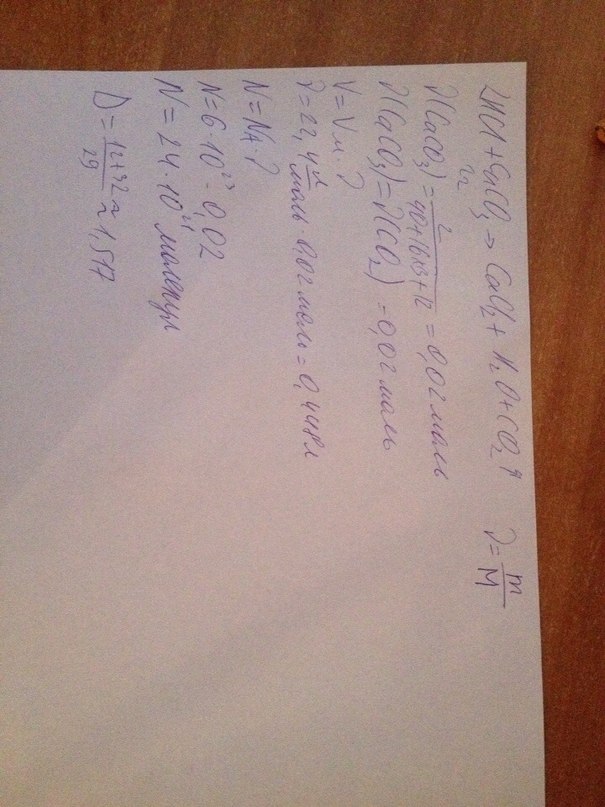 при действии соляной кислоты на карбонат кальция выделяется углекислый газ.Какой обьём(при н.у.)газа выделится при растворении 2г этой соли в кислоте? сколько молекул содержится в этом обьёме газа? чему равна плотность этого газа по воздуху?(решение)