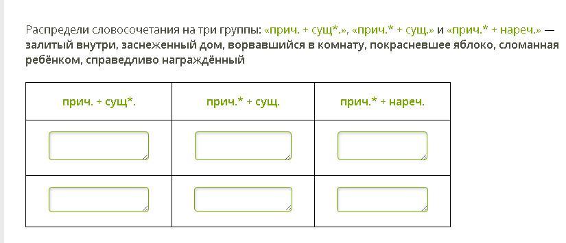 Распредели словосочетания на три группы: «прич. + сущ*.», «прич.* + сущ.» и «прич.* + нареч.» —