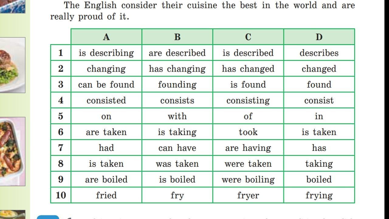 Traditional English cuisine … usually …(1) as conservative and un- varied. But national cuisine in Britain …(2) greatly by other national cuisines in recent decades. We can find types of food from all the corners of the world because of the people who come to Britain from all over the world and bring with them their recipes, culinary secrets and food. Italian, French, Chinese, Mexican, Greek, Indonesian and other national restaurants …(3) in Britain. As for traditional British cuisine the English usually have four meals a day: breakfast, lunch, tea, dinner and sometimes supper. In the morning they can have the full “English breakfast” or the “continental breakfast”. The full “English breakfast” …(4) of corn- flakes with milk and sugar, cheese or sausages, omelettes often with bacon, sausages or cheese, porridge (cereal), toast with marmalade, tea, coffee or orange juice. This classic English breakfast is rather substantial and as you see it includes not only porridge though cereals are very important in the national menu and are often cooked for breakfast. The “continental breakfast” consists …(5) a cup of tea or coffee with toast. It is not a substantial breakfast.Between 12 and 14 o’clock the English have lunch. Many people who work find it difficult to come home for lunch. So, they go to cafés, coffee bars, sandwich bars, restaurants, fast-food restaurants to have lunch. As a rule, lunch consists of sandwiches as it is a fast meal for many Englishmen. The English can choose all sorts of sand- wiches, such as sandwiches with meat, chicken, ham, bacon, cheese, fish, prawns, eggs, vegetables and lettuce. By the way, sandwiches with different fillings are a traditional British snack. They also can have steak, roast beef, pudding, fish and chips, potatoes and salad or fruit. Afternoon tea …(6) at about 5 o’clock. It is a traditional light meal after work. People enjoy their tea with biscuits, cakes, freshly baked sweet buns, scones and other pastries. The British drink tea with and without sugar, with lemon, ginger, cinnamon, honey or milk. It is im- possible to imagine the British cuisine without tea. The English have it 6 or 8 times a day, sometimes even more. It is their national drink. Dinner is the most substantial meal of the whole day and is taken at 7 o’clock. For dinner the British often have soup though it is not very popular in Britain. As the main course they have poultry, fish or meat with vegetables or mashed potatoes, roast chicken, turkey or lamb. They also can have the most well-known roast beef with grilled vegetables, roast potatoes or Yorkshire pudding. For dessert they …(7) pudding with ice cream or jam, a fruit pie, or cheese with biscuits. Supper in Britain is the last meal of the day and …(8) at 11 o’clock in the evening. It consists of just a cup of tea or coffee, a bowl of cream soup, cheese or fruit. But very often it is skipped. Of course, some dishes of the British cuisine are special. They are the famous shepherd’s pie, Cornish pasty, Scotch eggs, fish and chips. The famous shepherd’s pie is a potato casserole with minced beef. The Cornish pasty is a layered pie with meat, onion, potatoes, carrots and spices. The Scotch eggs, called picnic eggs, are common …(9) eggsthat are wrapped in minced sausages and breading and then fried or baked. The dish “fish and chips” consists of …(10) chops from fish and French fries. On Christmas Day a roast turkey is traditionally cooked for din- ner. It is served with vegetables like roast potatoes, carrots, cabbage, Brussels sprouts, peas, roast onions and other trimmings. And it is usually followed by Christmas pudding. As Great Britain is an island surrounded by some of the richest fishing areas of the world, fish is very important for the Englishmen, too. The English consider their cuisine the best in the world and are really proud of it.