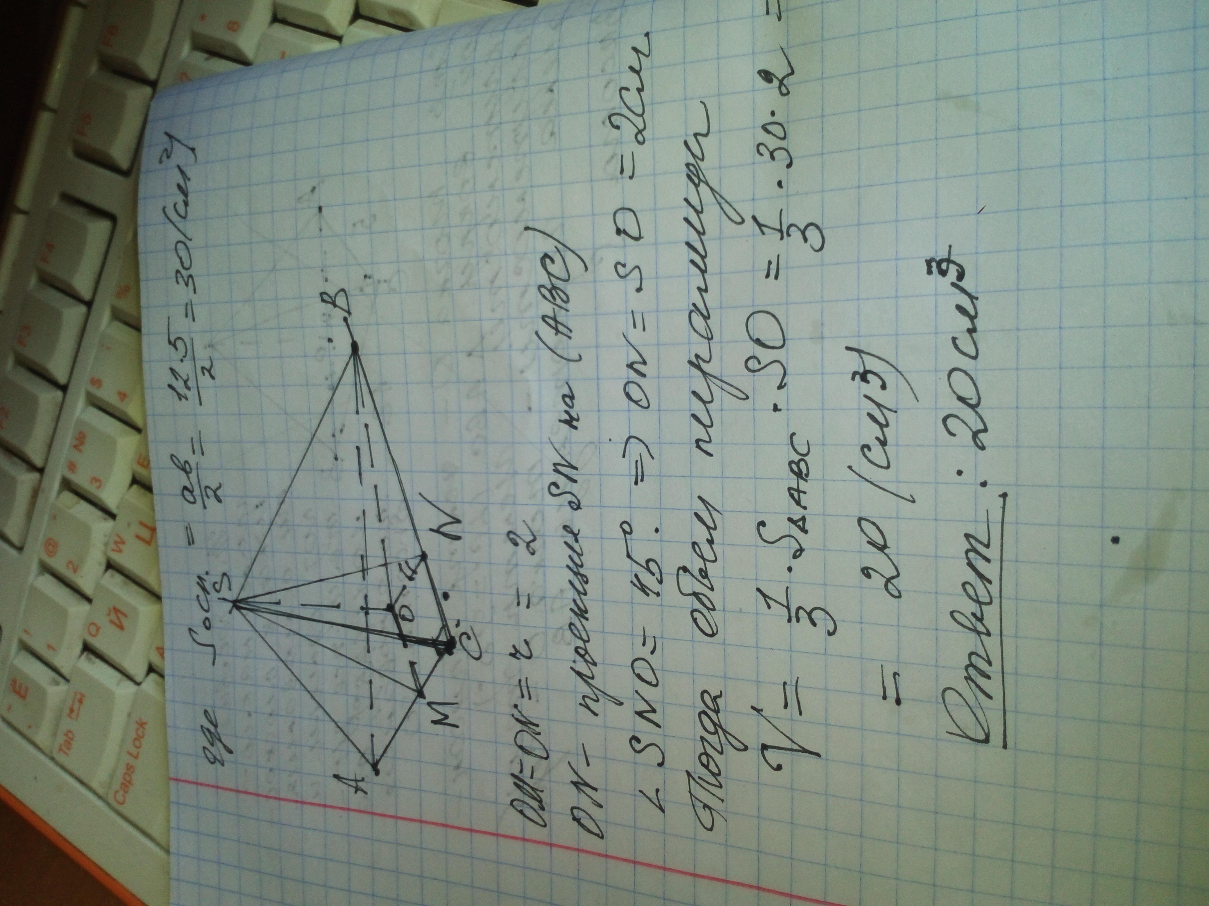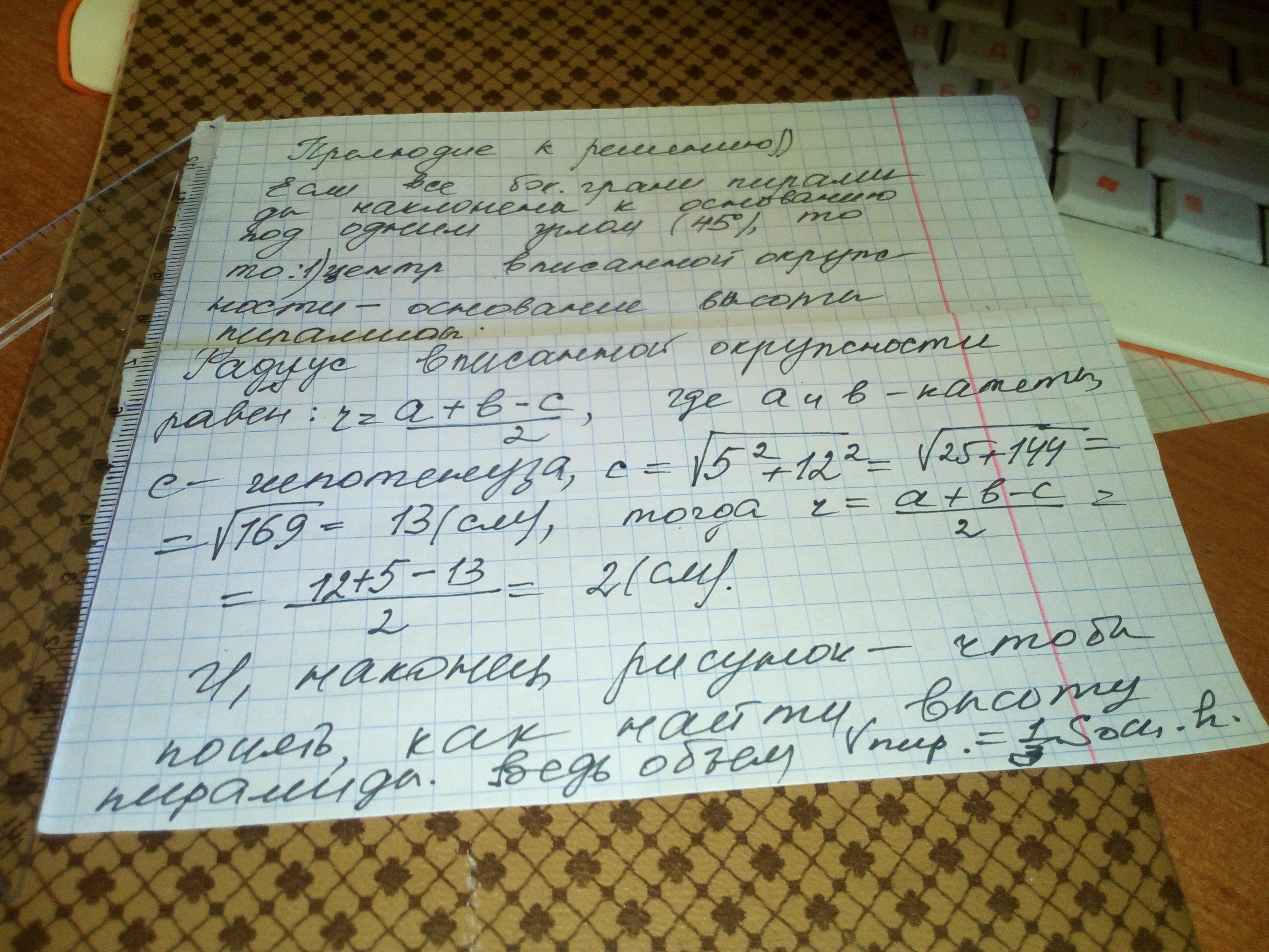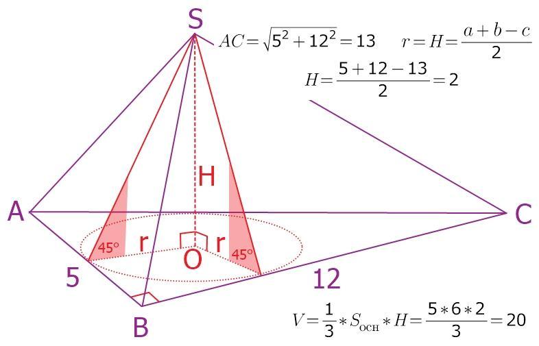 Основание пирамиды-прямоугольный треугольник с катетами равными 5 и 12см а боковые грани наклонены к плоскости основания под углом 45 градусов. Найти объём пирамиды. С рисунком