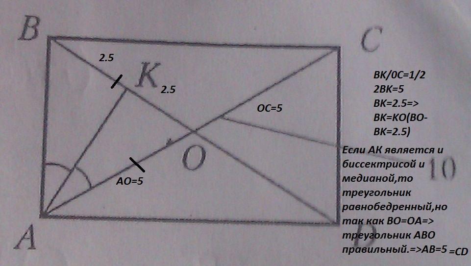 2) Т.К. АК - биссектриса треугольника ВОА, то ВК/ВА = КО/АО. отсюда находим ВА = 5*2,5/2,5=5/ CД=ВА=5