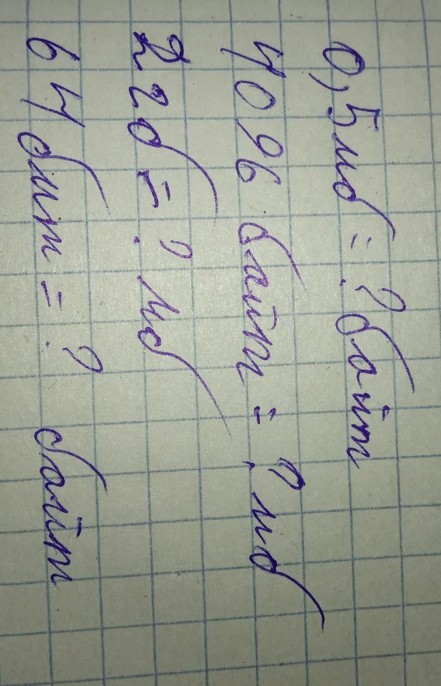 1)0,5мегабайт=512 килобайт=524288 байт