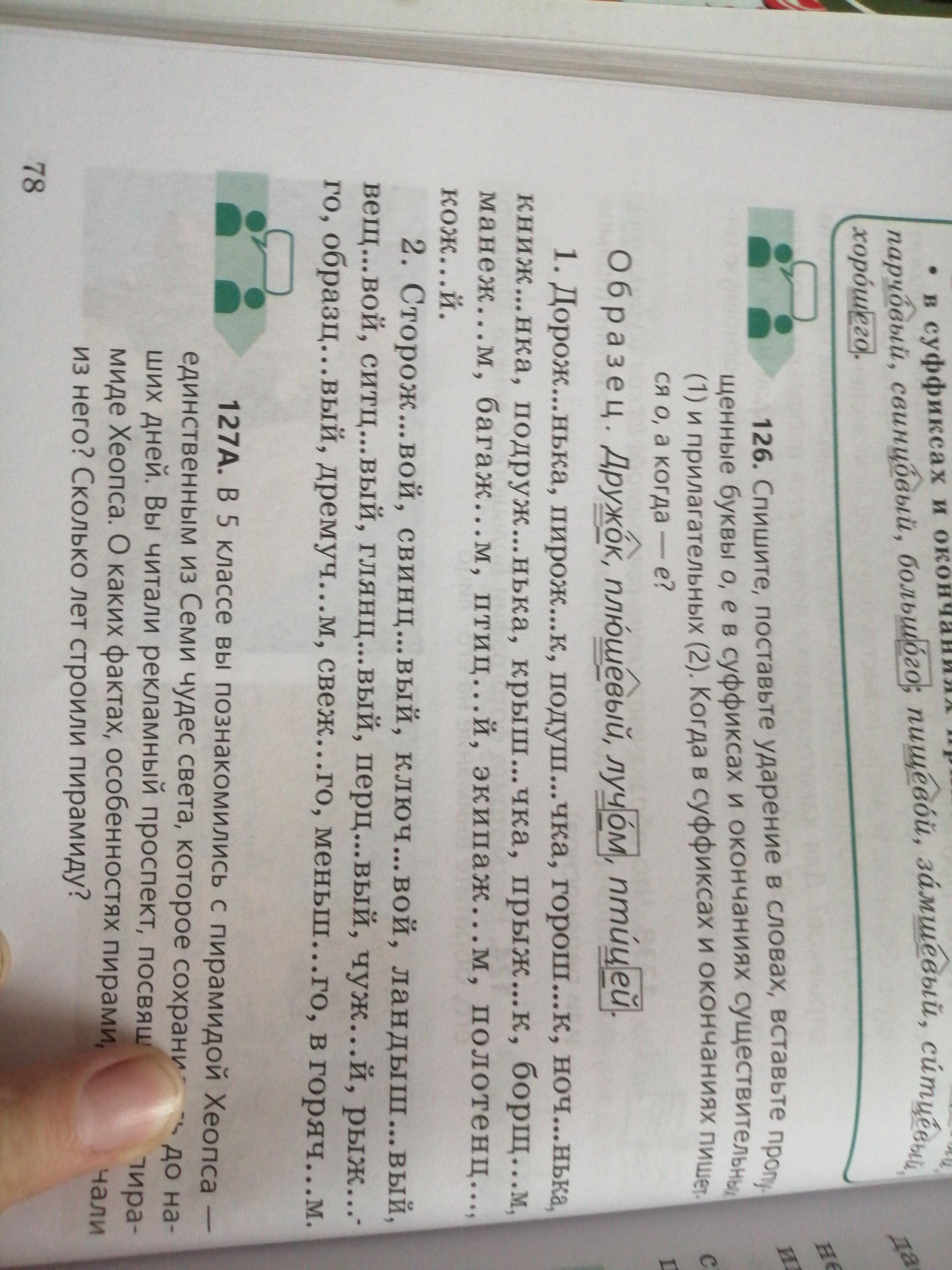 Ответ: 1. Дороженька, пирожок, подушечка, горошек, ноченька, книжонка, подруженька, крышечка, прыжок, борщом, манежем, багажом, птицей, экипажем, полотенцем, кожей.