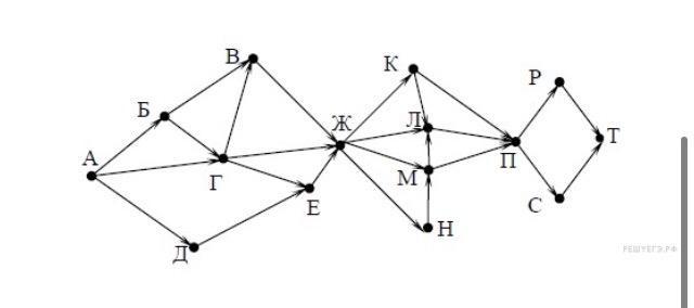 На рисунке представлена схема дорог, связывающих города А, Б, В, Г, Д, Е, Ж, З, И, К, Л, М. По каждой дороге можно двигаться только в одном направлении, указанном стрелкой. Сколько существует различных путей из города А в город М, проходящих через город Ж?