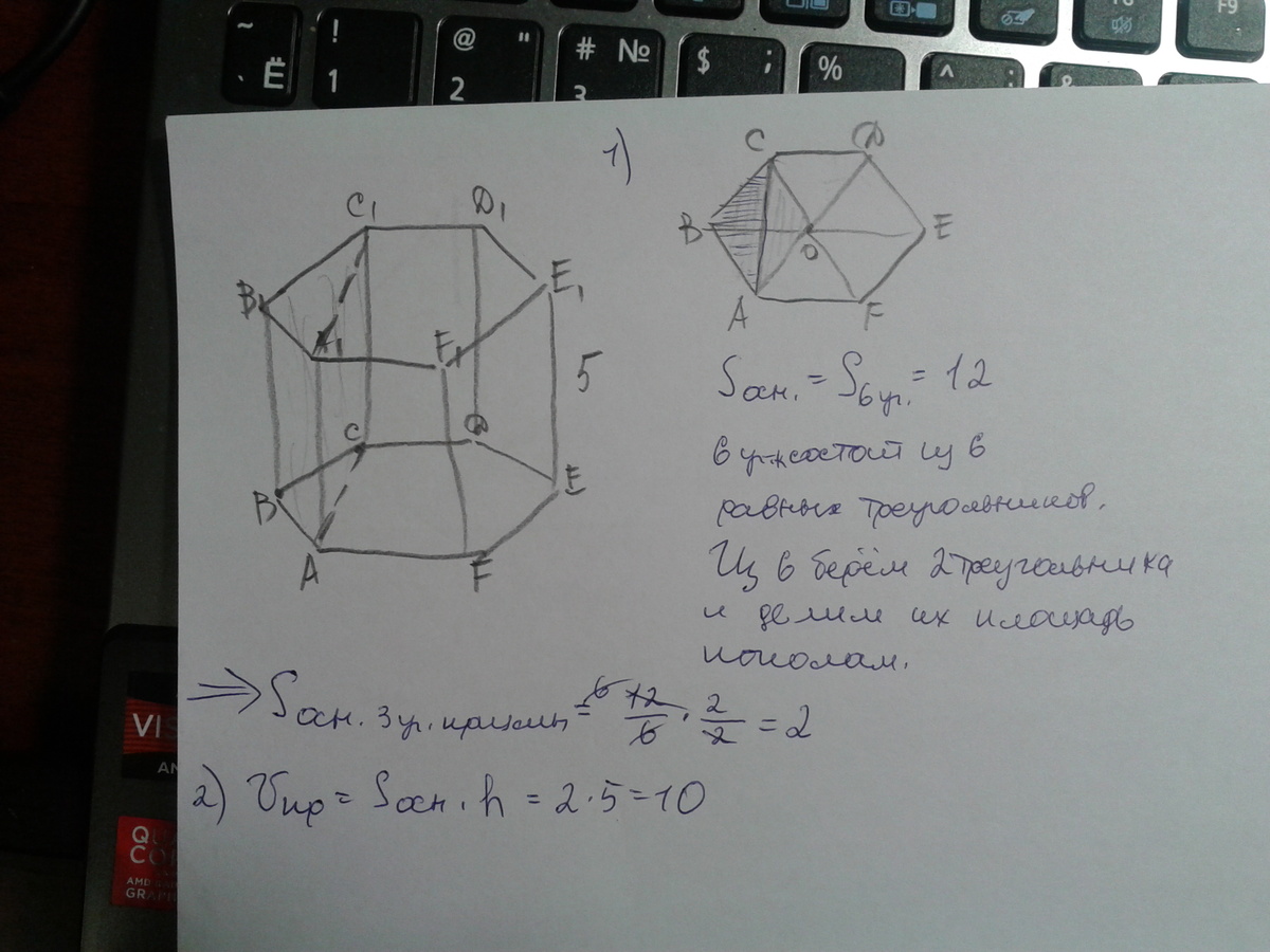 Найдите объем многогранника, вершинами которого являются вершины ABCA1B1C1 правильной шестиугольной призмы ABCDEFA1B1C1D1E1F1, площадь основания который равна 12, а боковое ребро равно 5.
