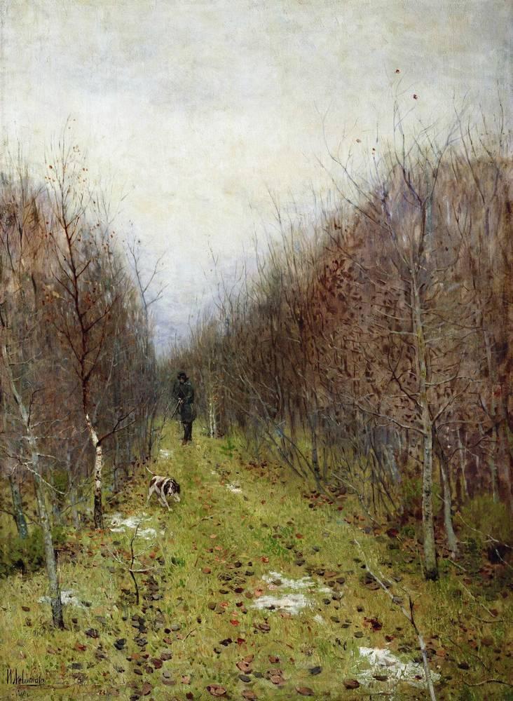 Пейзаж молодого Исаака Левитана «Осень. Охотник» очень напоминает другую его работу, более известную «Осень. Сокольники». Разница между ними всего год. Всё то же композиционное построение с динамичными, резкими сокращениями перспективы, благодаря чему работа может похвастаться глубиной и пространством. Всё то же хмурое осеннее небо, и всё та же незначительная роль человека – главным героем выступает природа.