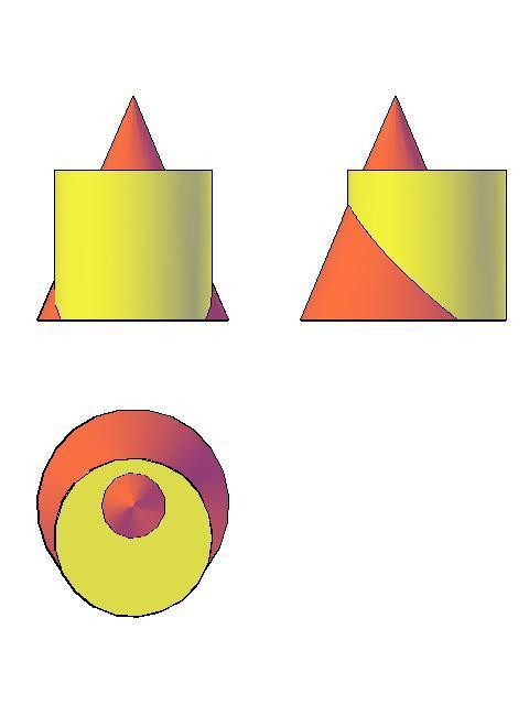 Помогите с этим заданием, нужно найти точки пересечения между цилиндром и конусом, т.е. чтобы после проекции соединить точки. Третий день и все бестолку, работа срочная. Я на нервном срыве( 25 баллов установил. Ее как и чем находить надо? Линиями? Сферами? Разрезать? Подскажите как или начертите
