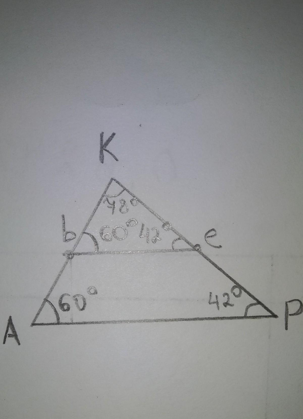 посторойте треугольник akp и отметье на стороне ak точку b. через точку b проведите прямую be, параллельную сторону ap. пусть e точка пересечения построеной прямой и стороны kp. измерьте и сравните велечины углов apk и bek