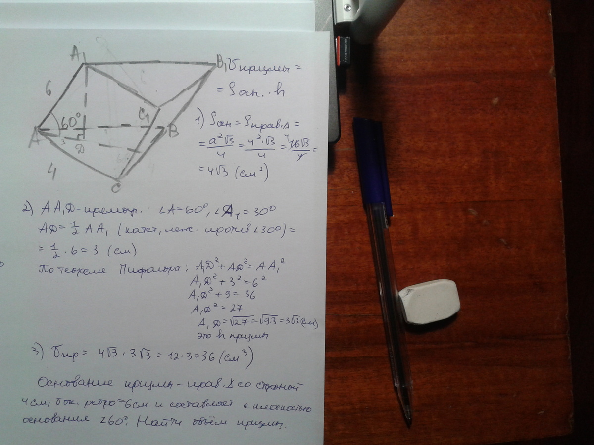 Основание призмы - правильный треугольник со стороной 4 см,боковое ребро равно 6 см и составляет с плоскостью основания угол 60 градусов.Найти объем призмы.