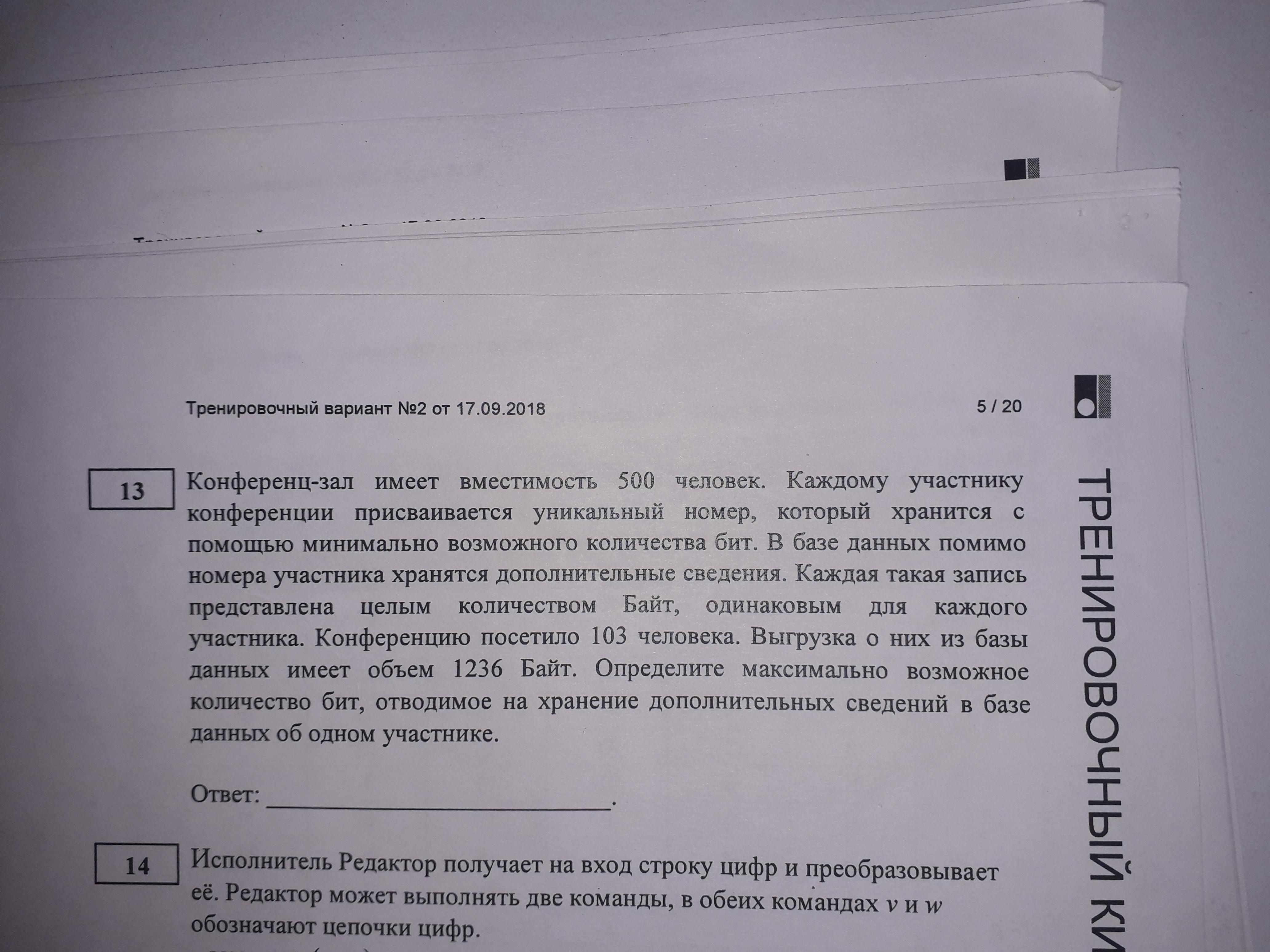 Конференцию посетило 103 человека. Выгрузка о них из базы данных имела объем 1236 Байт. Определите максимально возможное количество бит, отводимое на хранение дополнительных сведений в базе данных об одном участнике.