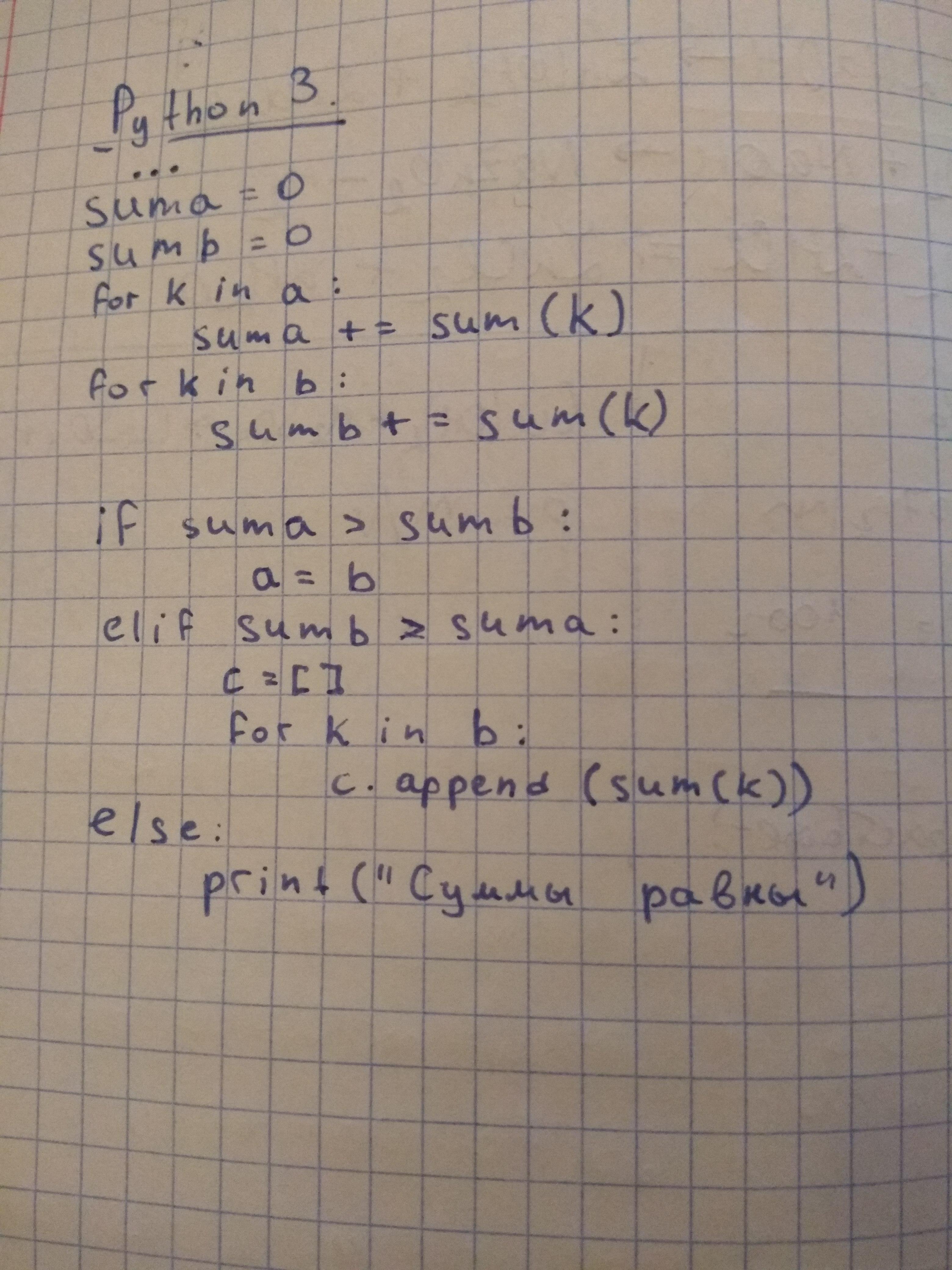 Очень срочно!!!!!!!!Дан двумерный массив а и двумерный массив b. Найти сумму элементов массива а, сумму элементов массива b. Сравнить значения, если сумма элементов массива а больше суммы элементов массива b, то все элементы массива а заменить на элементы массива b(размерность массива одинакова). Иначе, если сумма элементов массива b, больше суммы элементов массива а, тогда почитать сумму элементов каждой сточки массива b и записать их в одномерный массив с. Если суммы окажутся равны, вывести сообщение об этом.