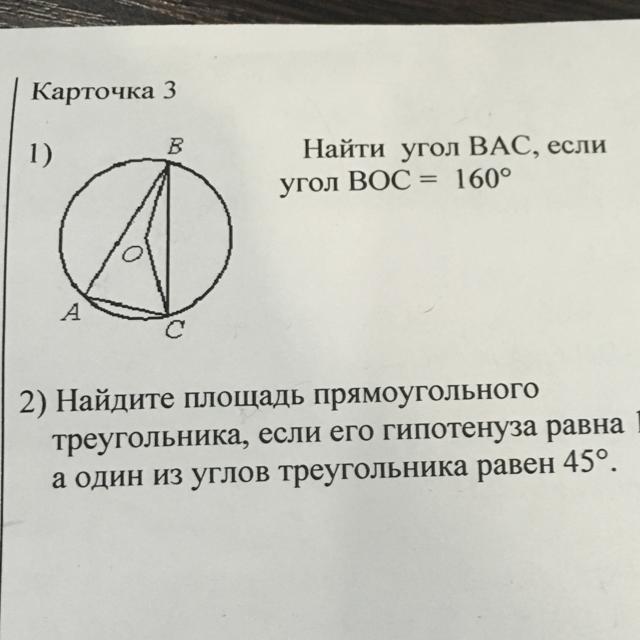 1) Угол ВОС центральный значит он равен дуге на которую он опирается. Значит дуга ВС равна 160 градусов. Угол ВАС вписанный значит он равен половине дуги на которую опирается. Тогда угол ВАС=1/2 дВС. Угол ВАС=1/2