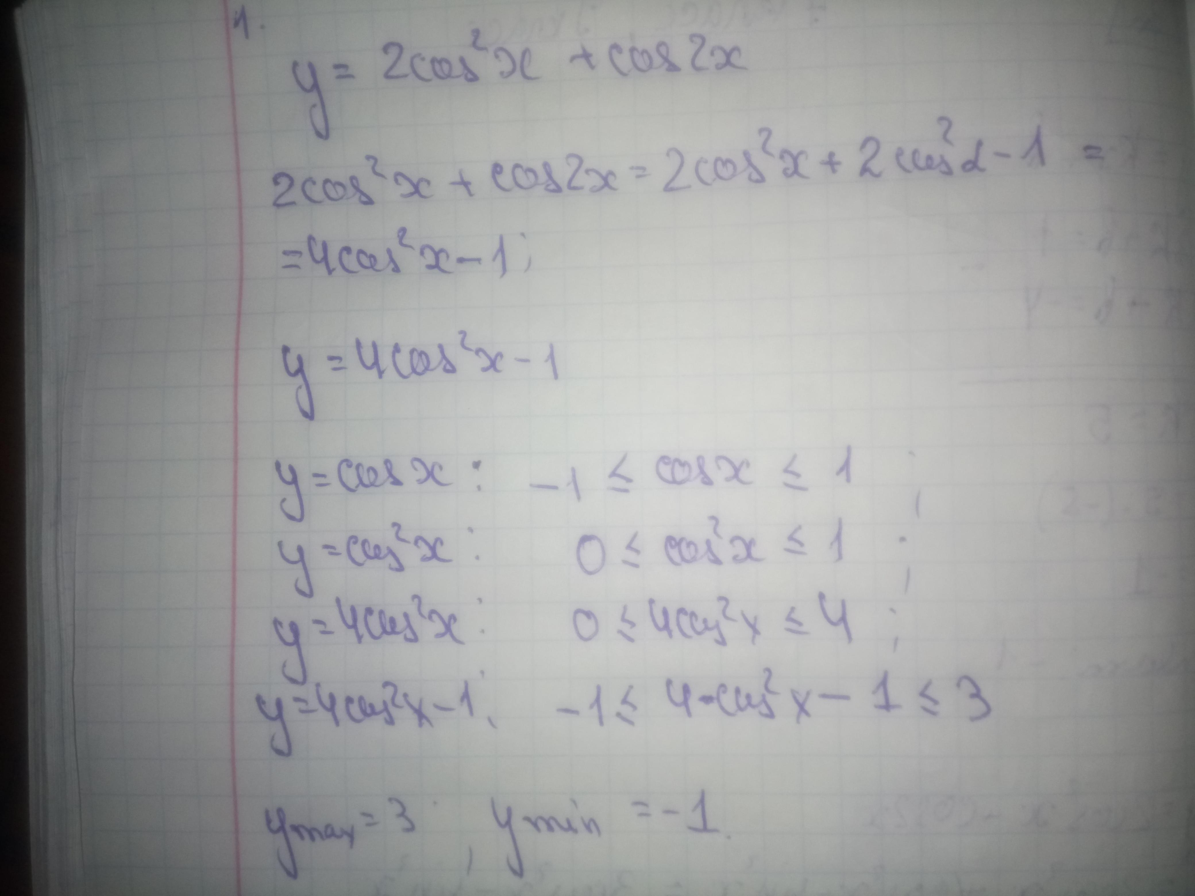 1. Найти наибольшее и наименьшее значение функции y=2cos^2x+cos2x