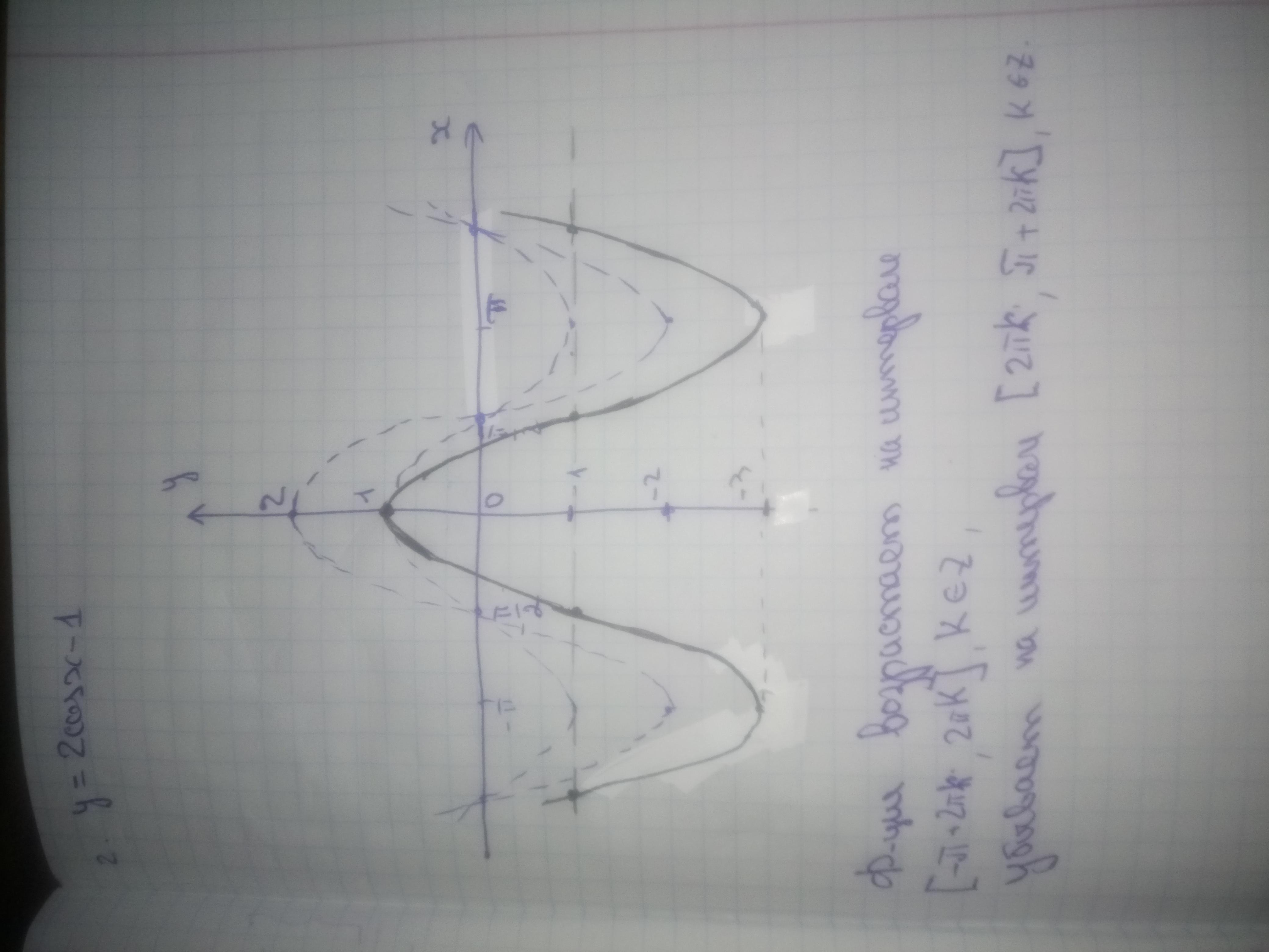 2. Построить график функции y=2cosx-1. При каких значениях x функция возрастает? Убывает?